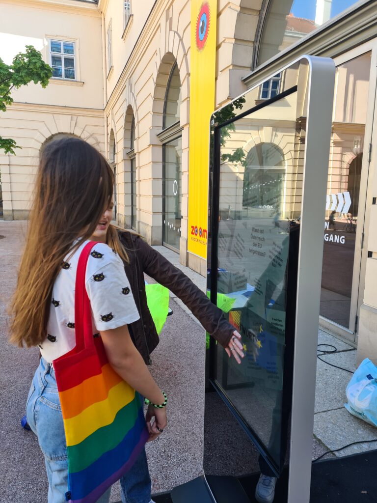 Der “Europify-Philo-Screen”(c) eignet sich besonders für den niederschwelligen Einsatz an Schulen, Bildungseinrichtungen und öffentliche Räumen bzw. bei Konferenzen und Veranstaltungen. Auf Anfrage unter office@europify.at kann dieser gerne angemietet werden.